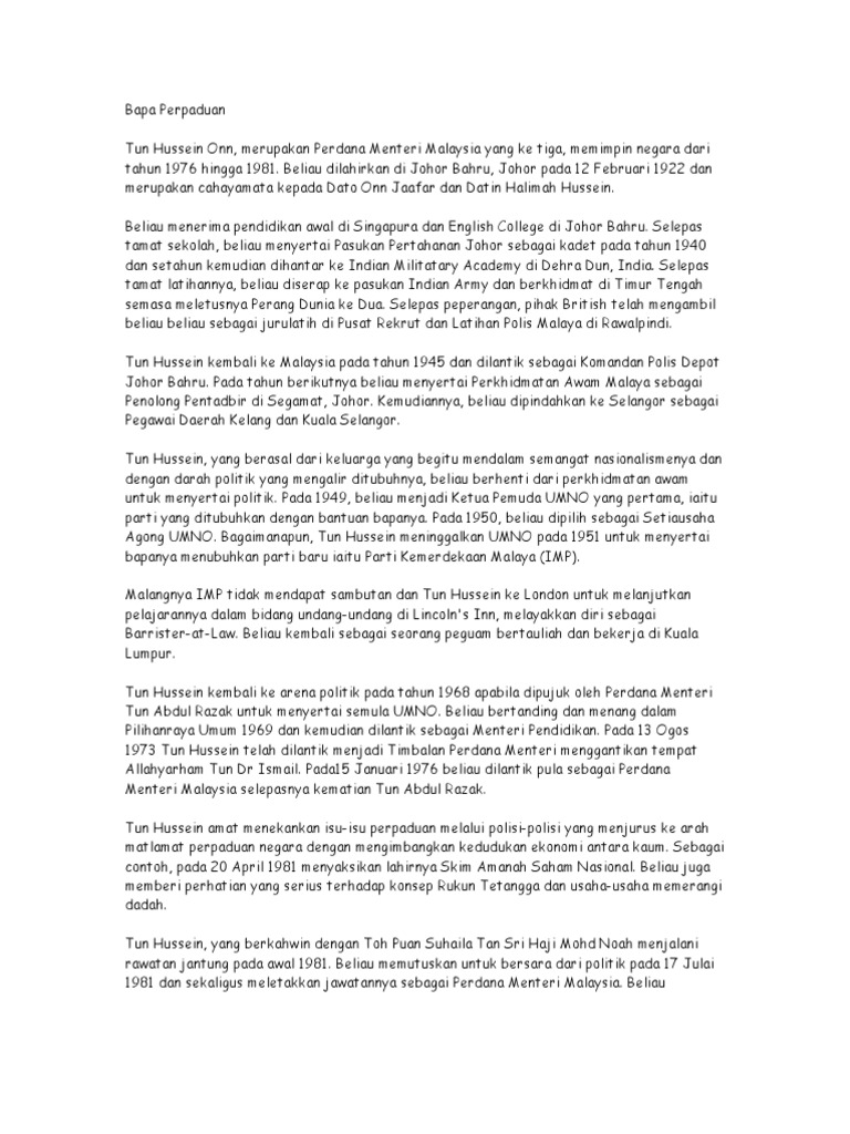 Allahyarham tun hussein bin dato' onn juga dikenali sebagai 'bapa perpaduan' kerana berjaya memupuk semangat perpaduan berbilang kaum yang lebih erat dalam masyarakat malaysia. .tun hussein onn background and early life: He was the son of dato' onn jaafar, the founder of umno and a malayan. Tun hussein onn lahir di johor bharu pada 12 februari 1922. Hussein bin dato' onn (february 12, 1922—may 29, 1990) who is of 3/4 malay and 1/4 turkish (of circassians extraction) ancestry was the third he was granted the soubriquet bapa perpaduan (father of unity).